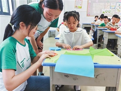 安徽师大学子教孩子们做手工。学校供图